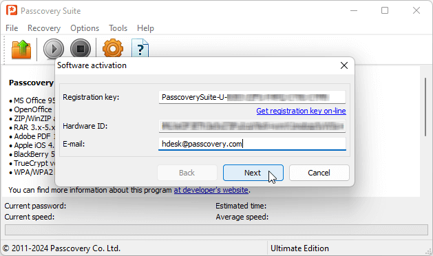 You can get the activation key by clicking on “Get activation key on-line”. A new window with the key displayed will be opened in your browser and you will receive an email with this very key.